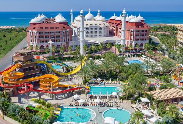 Manavgat'ta Akdeniz'in maviliğine komşu, hurma ağaçlarıyla çevrili yemyeşil bir doğanın içinde konumlanan Royal Taj Mahal tatilde üst düzey bir konforun adresi. Etkileyici mimarisinin ilhamını Hindistan'daki aşk mabedi Tac Mahal'den alan tesis, peyzajıyla ve otantik atmosferiyle de tatiline biraz romantizm katmak isteyenlerin tercihlerinde başı çekiyor. 40.