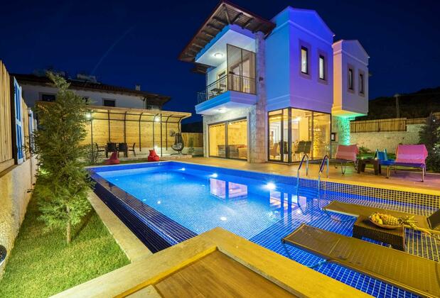 Havuzlu Kaş villalarından Villa Beyaz Ay, mahremiyetine önem verenlerin ilk tercihi. Etrafı tamamen kapalı villa, konuklarının sessiz ve sakin bir tatil geçirmesi için hazırlanmış. Çim döşeli güneşlenme alanı ve masmavi havuzuyla dikkat çekiyor. Gün boyu güneşlenebilirsiniz.